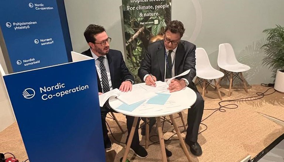 Eron Bloomgarden (left), Executive Director of Emergent, and Franz Tattenbach, Costa Rican Minister of Environment and Energy, signing the emission reduction purchase agreement at COP28 in Dubai, December 4, 2023 (Photo: Costa Rican Ministry of Environment and Energy)