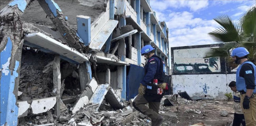 A joint OCHA and UN Mine Action Service team assesses a school in Gaza to identify any risks of unexploded ordnance. (Photo by Zein Tayyeb / OCHA)