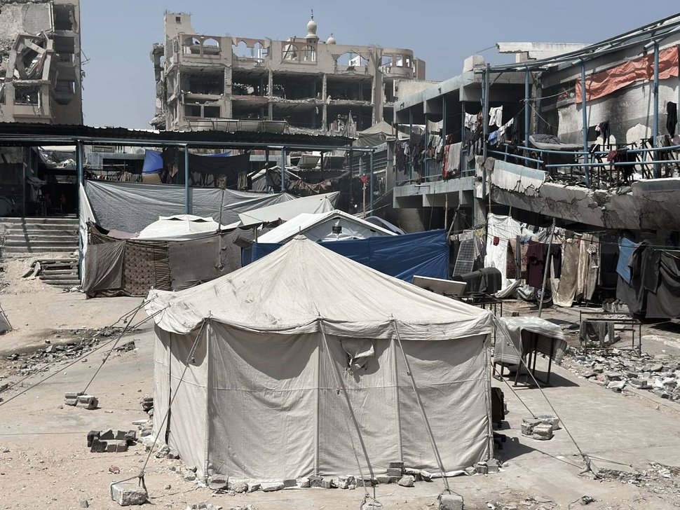 Forcibly displaced people seek shelter in a destroyed UNRWA school in Gaza City, June 2025 (Photo by UNRWA)