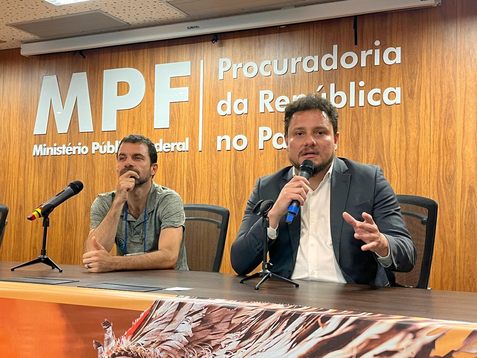 Felipe de Moura Palha, Federal Prosecutor in Pará (right) and Fernando Merloto Soave, Federal Prosecutor from the state of Amazonas, at the launch of the advisory document for federal public prosecutors on the carbon credit market in Belém, May 22, 2025 (Photo: Yasmim Bitar / Office of the Federal Public Prosecutor in Pará)