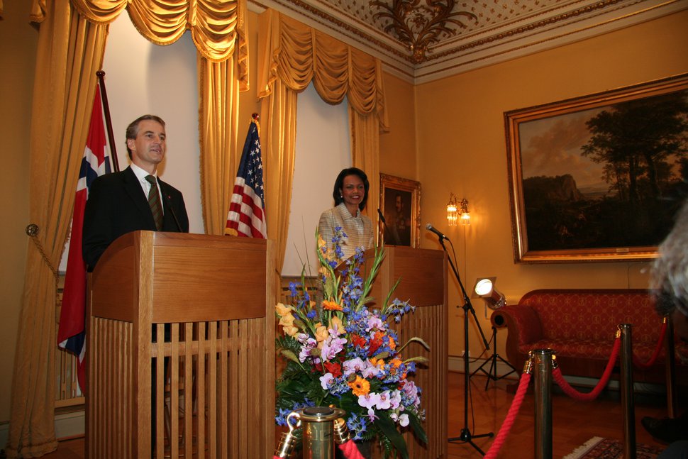 Foreign Ministers Jonas Gahr Støre and Condoleezza Rice met for private talks prior to the Oslo meeting.