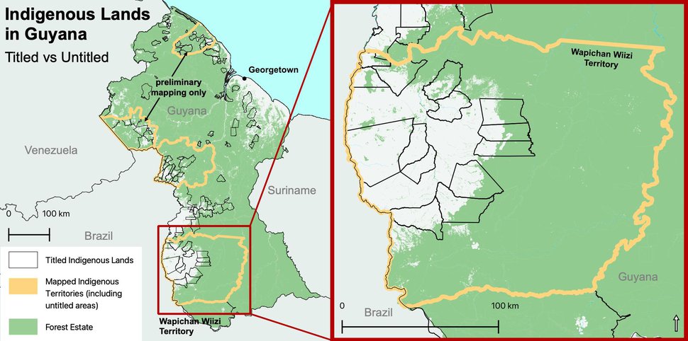 Indigenous Lands in Guyana - Titled vs Untitled. Produced for Development Today by Rainforest Foundation US based on indicative and GPS mapping of customary use areas with four district councils. (Cameron Ellis / Rainforest Foundation US)