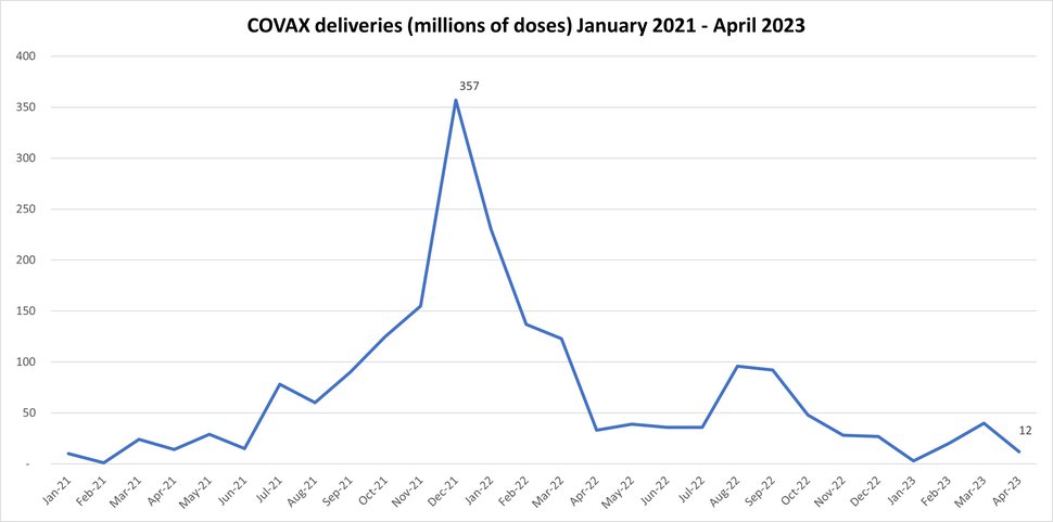 Deliveries of COVID-19 vaccines to lower-income countries by COVAX from January 2021 to April 2023. Source: UNICEF – COVID-19 Market Dashboard