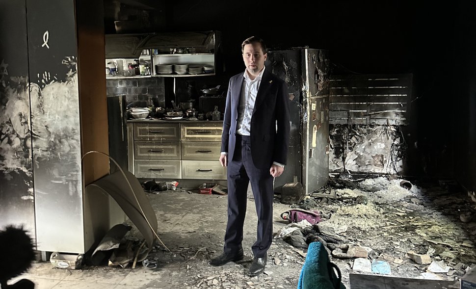 Swedish Development Minister Benjamin Dousa (Moderaterna) during a recent visit to the Middle East. Pictured here at the Nir Oz Kibbutz in Southern Israel which was attacked by Hamas on October 7, 2023. (Photo by Linn Laurin / Swedish Foreign Ministry)