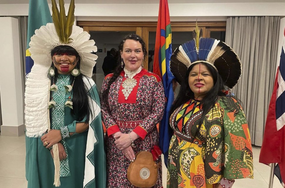 The photo, dated May 3, 2023, marked a commemoration of the 40-year anniversary of the Norwegian Indigenous Peoples' Programme at the Norwegian Embassy in Brasilia. Federal Deputy Célia Xakriabá (left) and Minister of Indigenous Peoples Sonia Guajajara of Brazil, and Norwegian Sámi Parliament President Siljie Karine Muotka (centre). (Photo: Norwegian Embassy in Brazil)