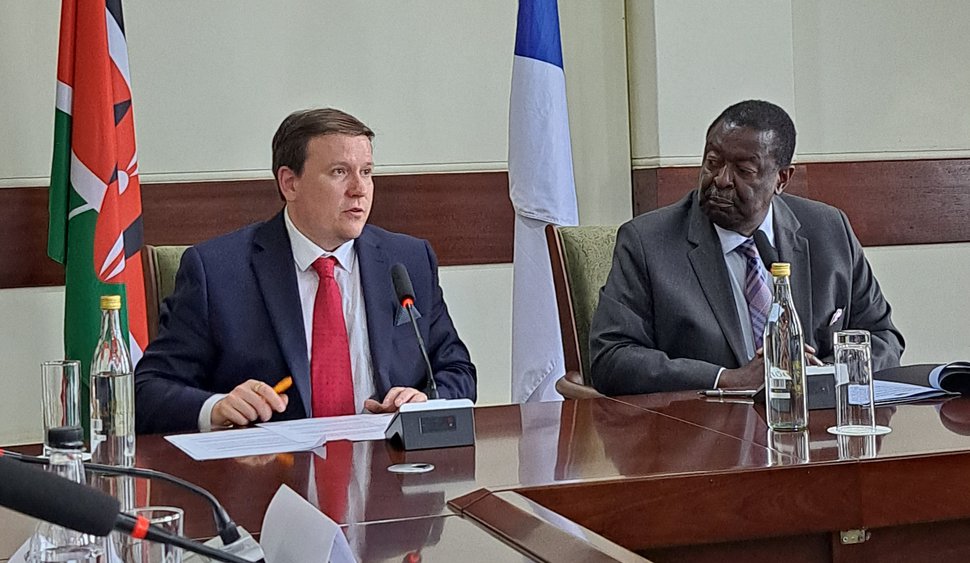 Finnish Minister of Development and Trade Ville Tavio says trade and business can be better tools for building partnerships with African countries than aid. Finland has ended bilateral aid to Kenya, but will extend business relations. Tavio (left) and Kenyan Prime Cabinet Secretary Wycliffe Musalia Mudavadi in Kenya last month. (Photo: Tähti Tuomas)