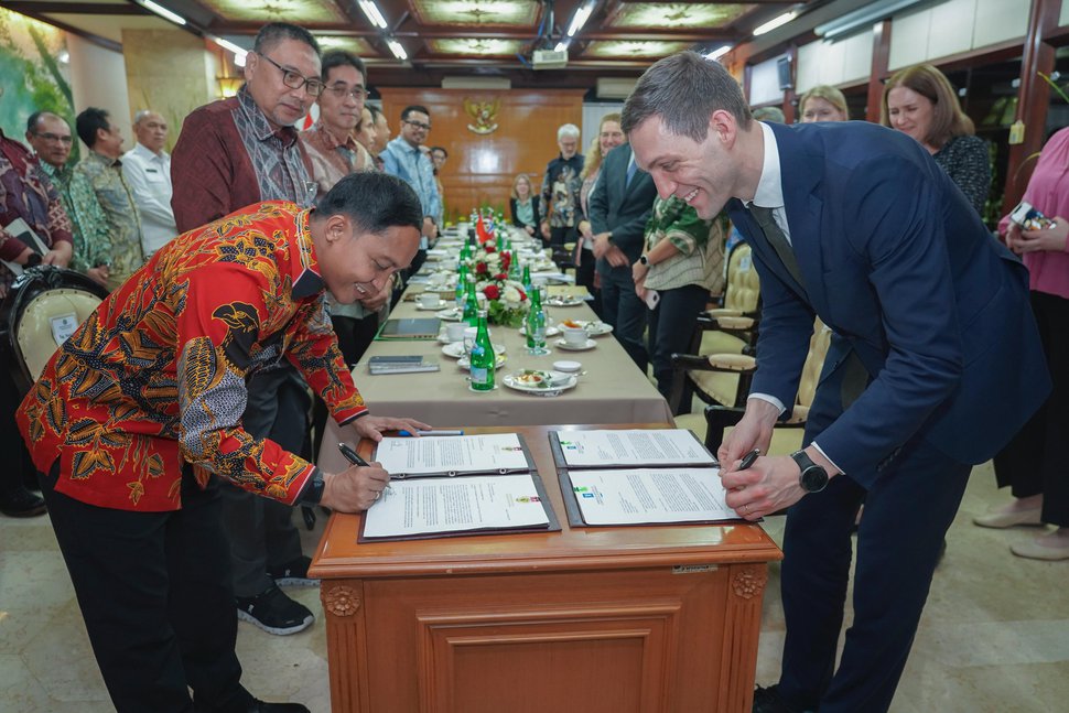 On February 21, 2025, Indonesian Forestry Minister Raja Juli Antoni (left) and Norwegian Climate Minister Andreas Bjelland Eriksen extended bilateral forest cooperation until 2030. On March 10, 2025, Norwegian embassy officials in Jakarta met with the Ministry of Forestry to raise concern about recent media reports of political nepotism in the Indonesian Environment Fund. (Photo: Norwegian Climate Ministry)