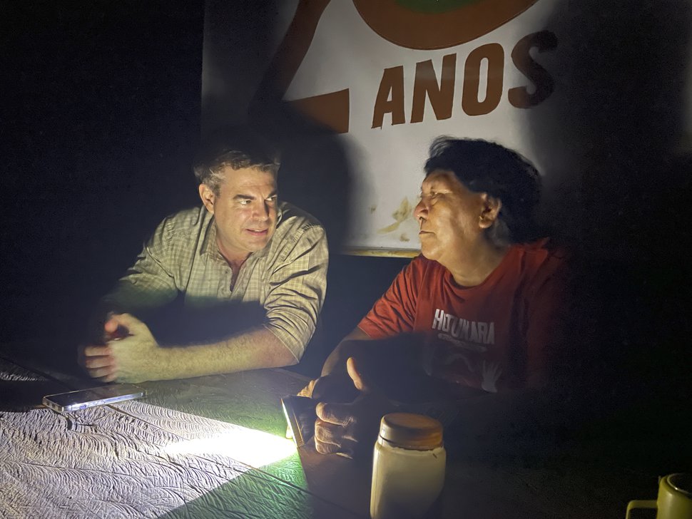 Kristian Bengtson, who manages the indigenous support programme of the Norwegian Embassy in Brasilia, at the 20th anniversary of Hutukara Association Yanomami with leader and shaman Davi Kopenawa in 2024 (Photo: Bruno Kelly)