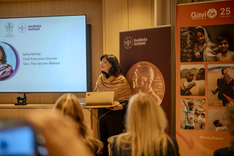 Gavi CEO Sania Nishtar visited Stockholm in October but did not secure a new Swedish funding commitment. She spoke at a seminar organised by Karolinska and SSE. (Photo by the Center for Resilient Health at the Stockholm School of Economics)